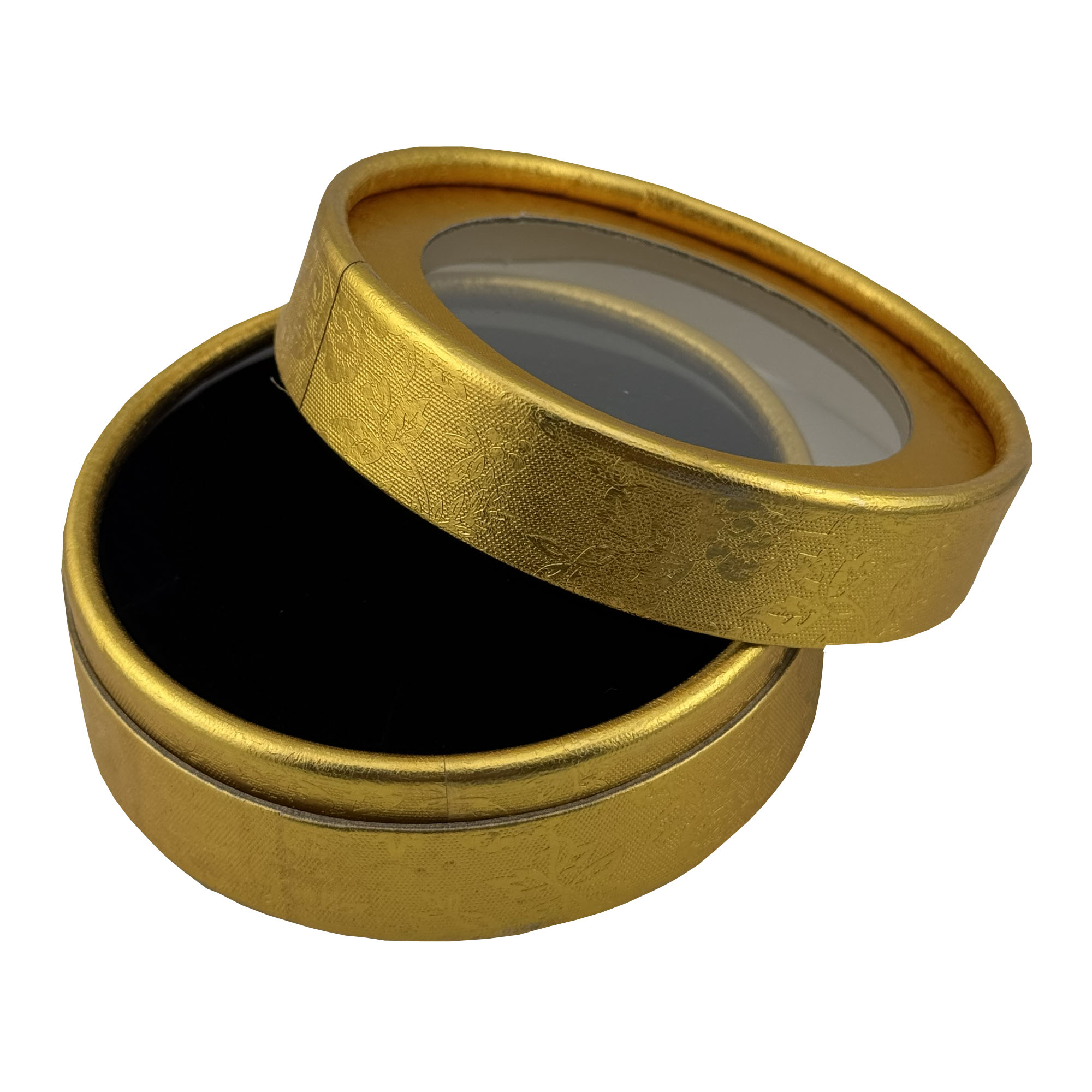 Set 12 Cutii pentru Martisoare/Brose, Flippy, Model Auriu, Forma Rotunda cu Capac Transparent tip Display, Carton Rigid, Interior Moale, Diametrul 8 cm