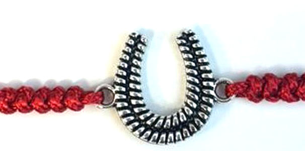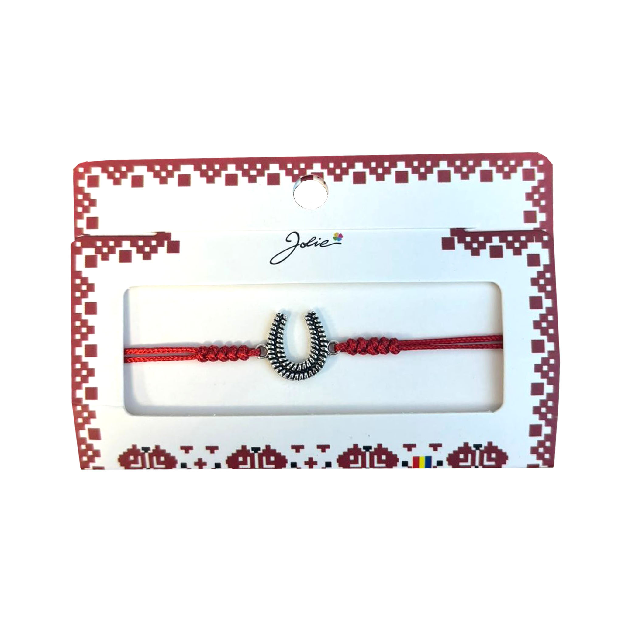 Martisor tip Bratara cu Pandantiv Metalic, Jolie, cu Snur Textil Rosu Impletit, Model Potcoava, Dimensiune Reglabila, Ambalata Individual