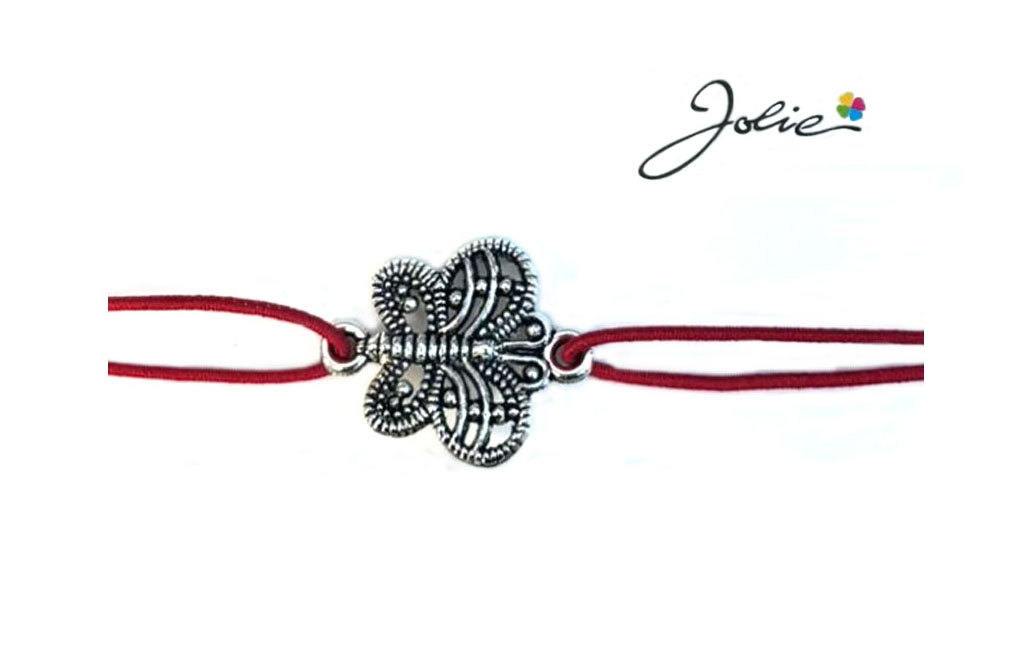 Martisor tip Bratara cu Pandantiv Metalic, Jolie, Snur Textil Rosu, Model Fluture, Dimensiune Reglabila, Nod Dublu, Ambalata Individual