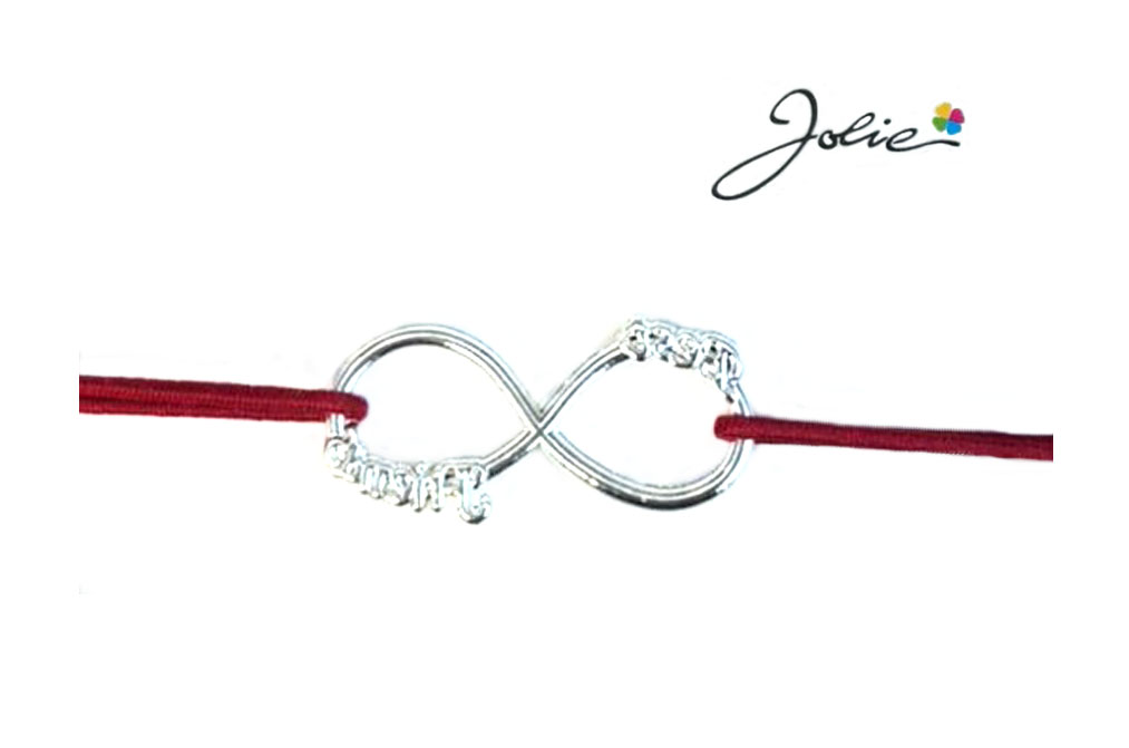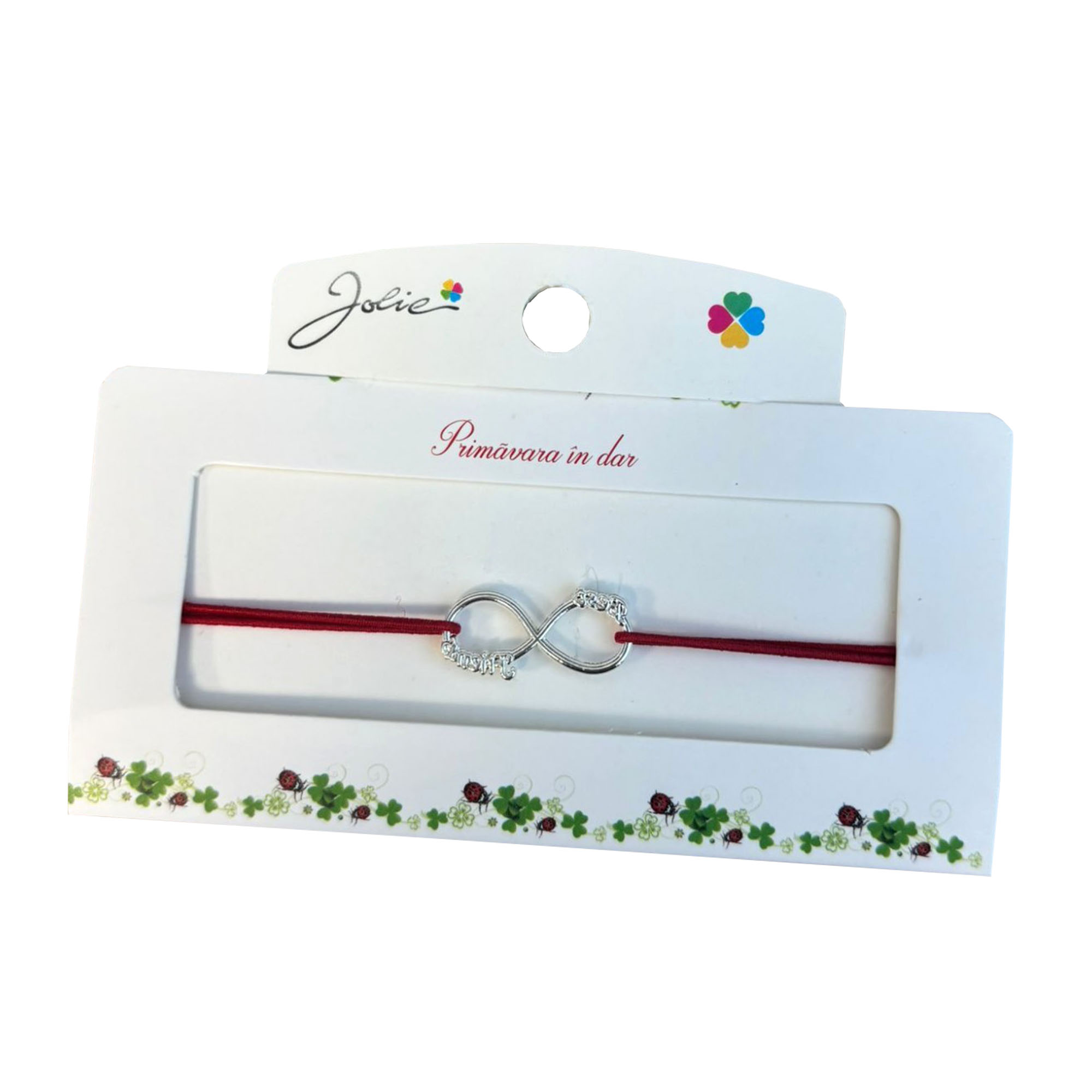 Martisor tip Bratara cu Pandantiv Metalic, Jolie, Snur Textil Rosu, Model Infinit, Dimensiune Reglabila, Nod Dublu, Ambalata Individual