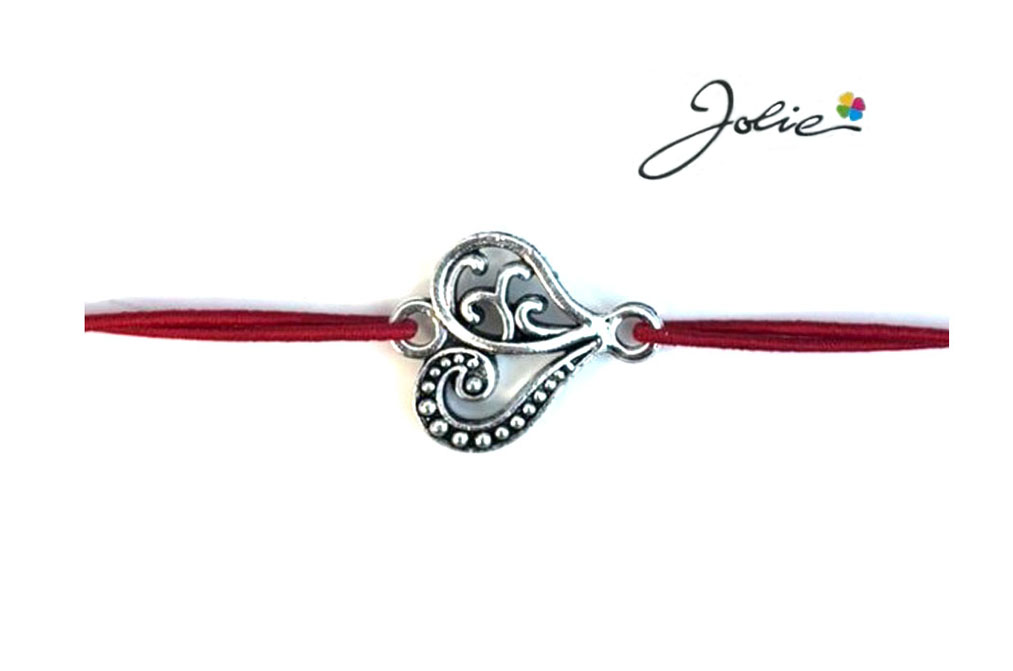 Martisor tip Bratara cu Pandantiv Metalic, Jolie, Snur Textil Rosu, Model Inima Eleganta, Dimensiune Reglabila, Nod Dublu, Ambalata Individual