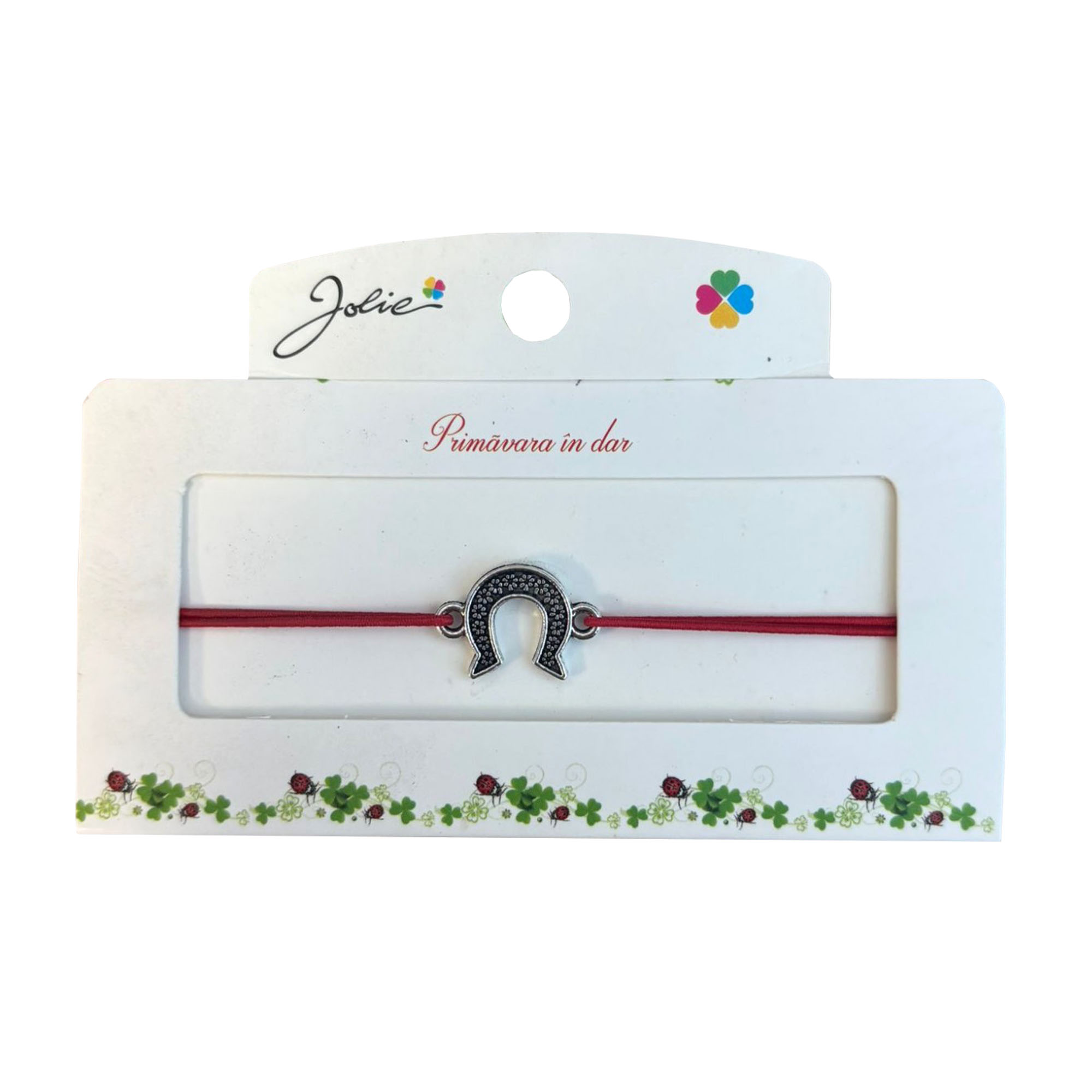 Martisor tip Bratara cu Pandantiv Metalic, Jolie, Snur Textil Rosu, Model Potcoava Flori, Dimensiune Reglabila, Nod Dublu, Ambalata Individual