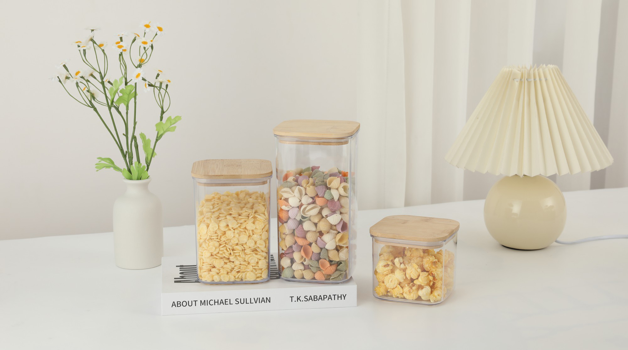 Cutie de Depozitare Alimente, Flippy, Cutie de tip Container, Cutie pentru Cereale, din Plastic, Capac din Bambuc, 10 x 10 x 19 cm, Volum 1.2l, Transparent