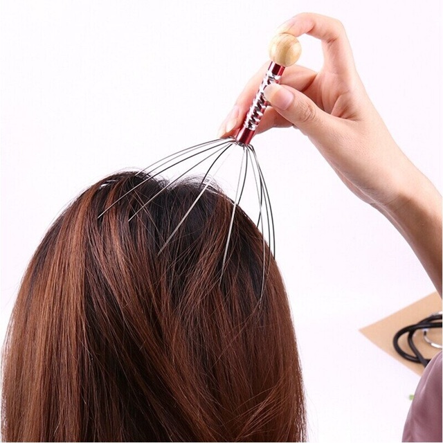 Dispozitiv Masaj Capilar, Flippy, Tip Caracatita, 12 Brate din Otel Inoxidabil, Maner din Lemn, Stimulare Circulatie Sanguina, Accelerarea Cresterii Parului, Anti-Stres, Multicolor