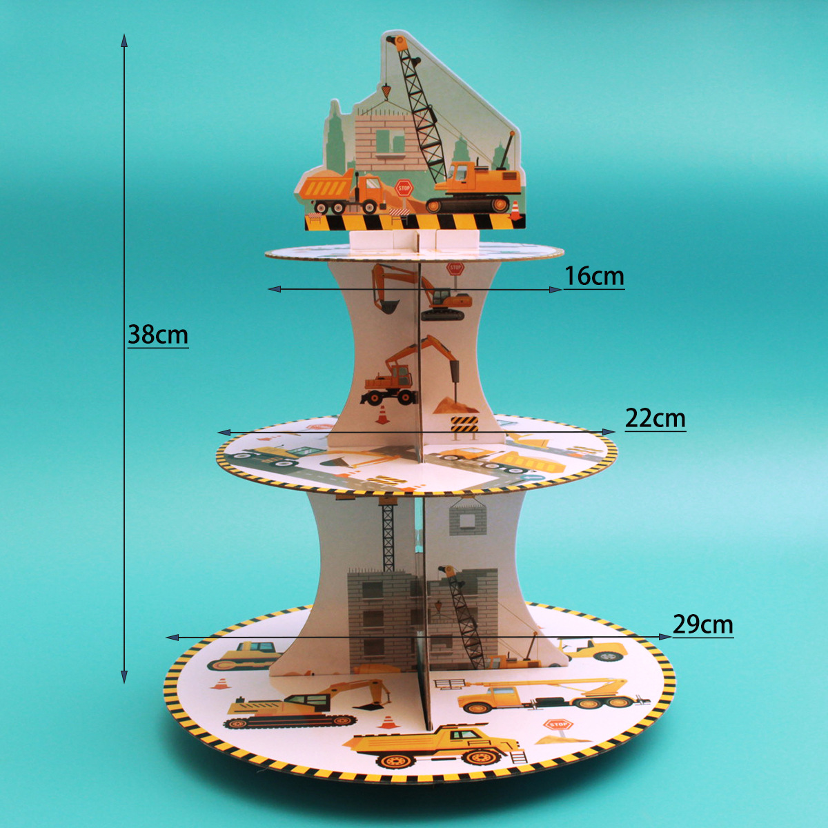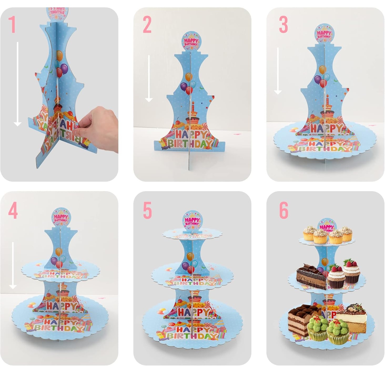 Etajera pentru Prajituri, Flippy, din Carton, 3 Nivele, 16/22/29 cm Diametru, Inaltime 38 cm, Tema Happy Birthday, Roz