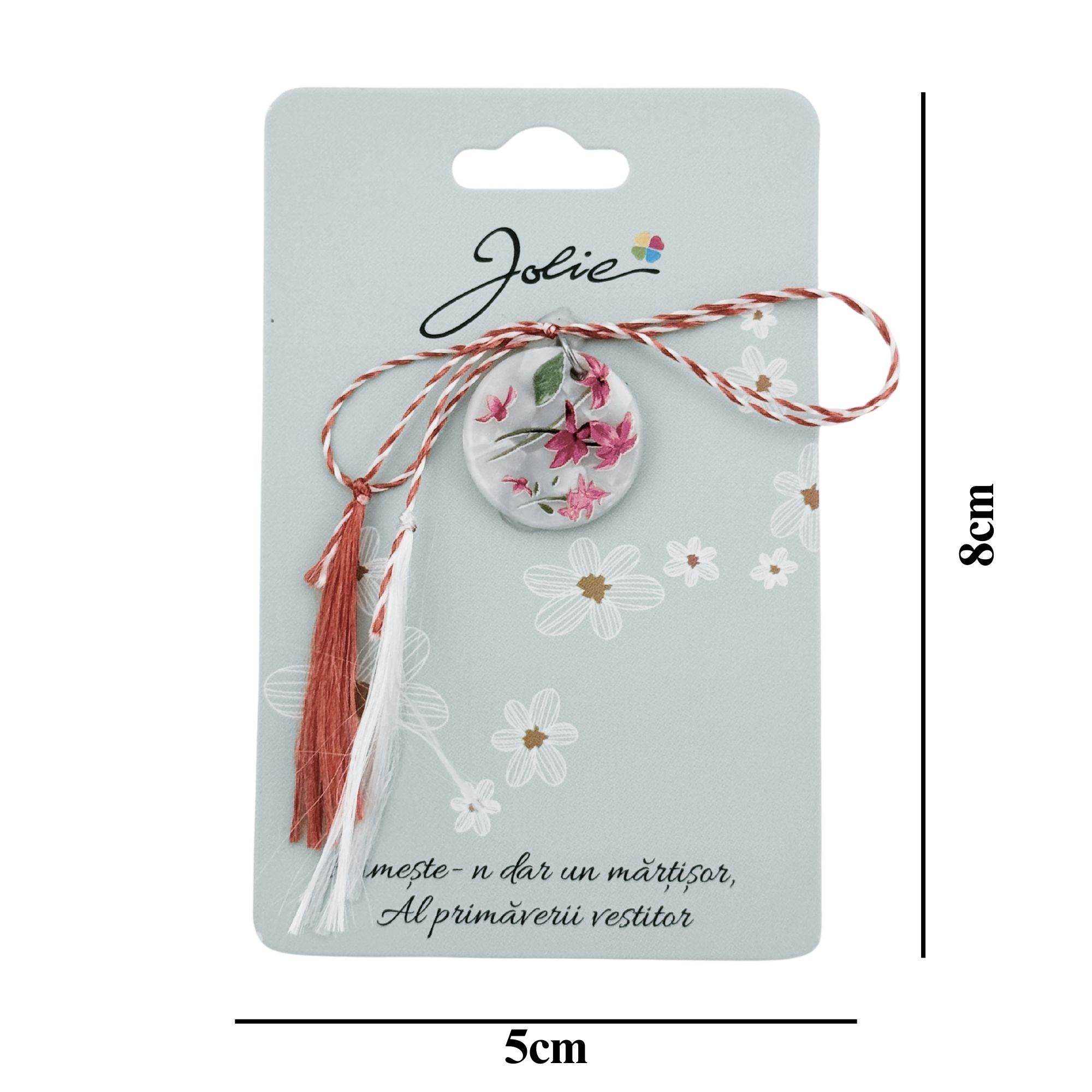 Martisorul traditional Jolie este un accesoriu delicat, cu design floral, ideal pentru a fi oferit in dar de 1 Martie. Realizat din acril, cu pandantiv rotund decorat cu flori roz (diametru pandantiv 2 cm), acest martisor adauga un plus de culoare si veselie la inceput de primavara.