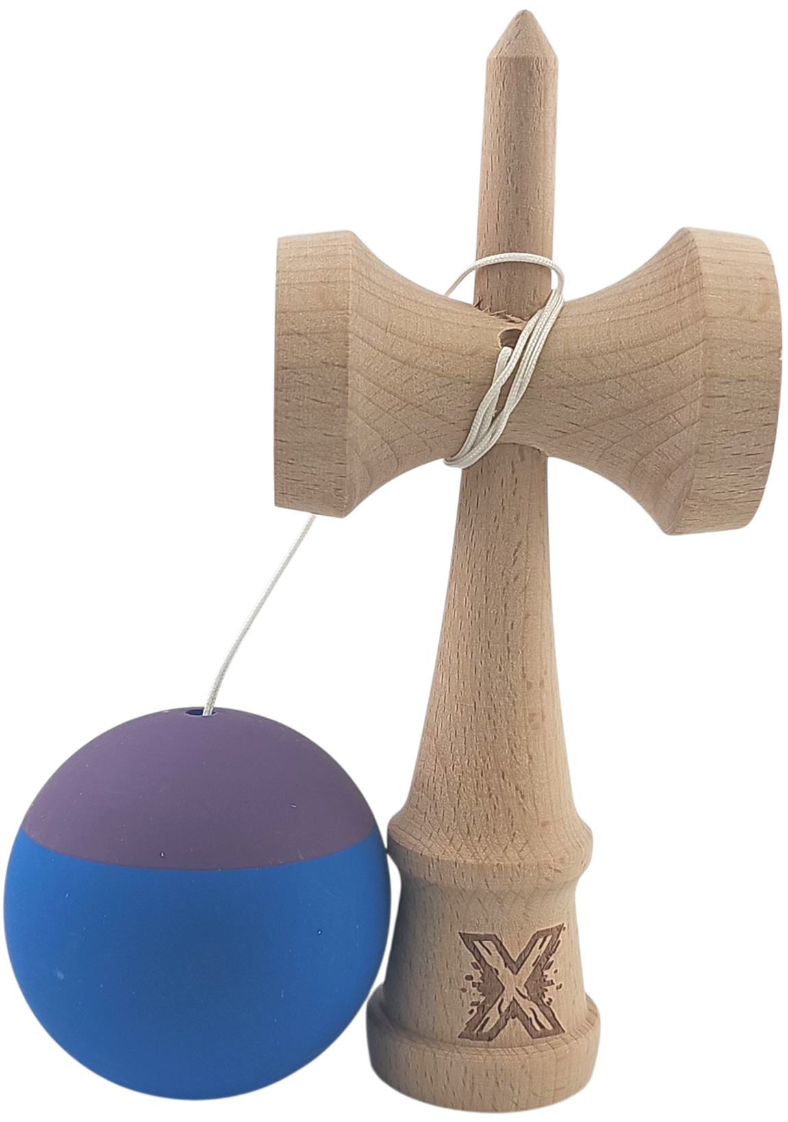 Kendama X Originala, Profesionala, Flippy, din Lemn, Rubber Grip, 18 cm, Albastru/Mov