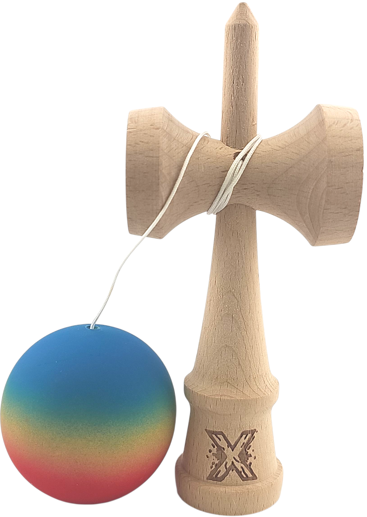 Kendama X Originala, Profesionala, Flippy, din Lemn, Rubber Grip, 18 cm, Gradient Albastru/Galben/Rosu