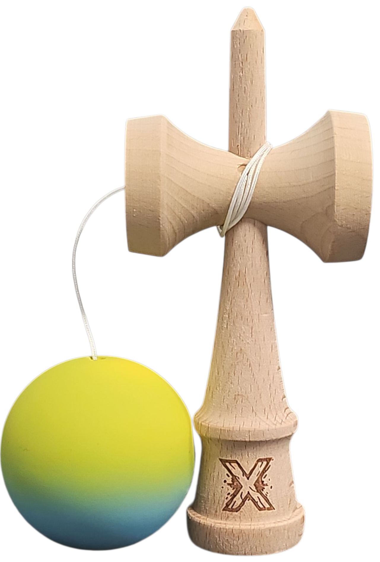Kendama X Originala, Profesionala, Flippy, din Lemn, Rubber Grip, 18 cm, Gradient Galben/Albastru/Verde