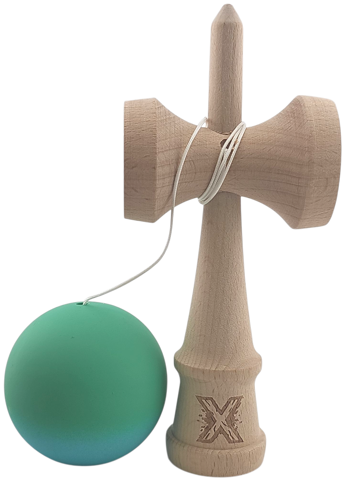 Kendama X Originala, Profesionala, Flippy, din Lemn, Rubber Grip, 18 cm, Gradient Turcoaz/Alb