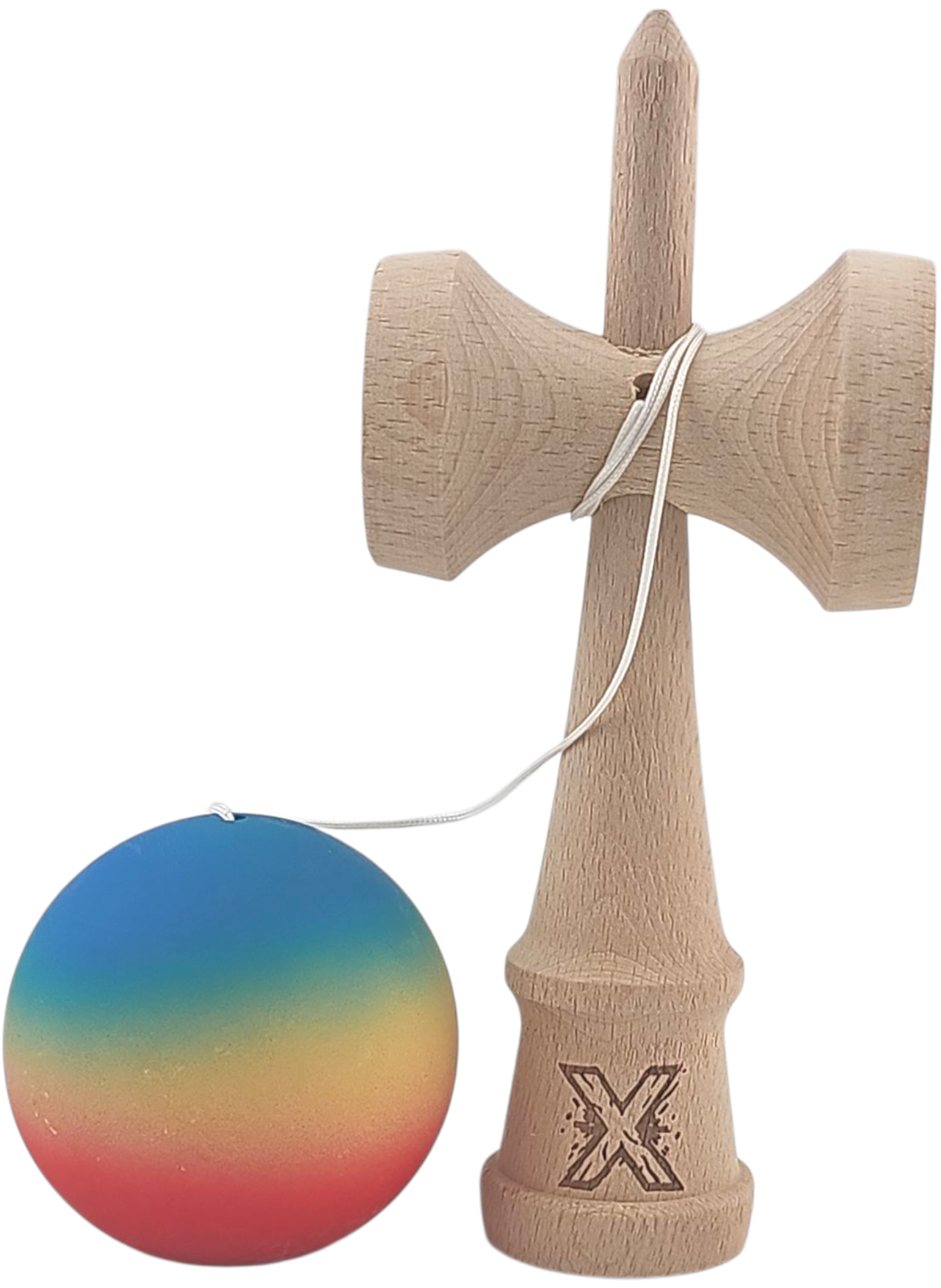 Kendama X Originala, Profesionala, Flippy, din Lemn, Rubber Grip, 18 cm, Rosu/Galben/Albastru