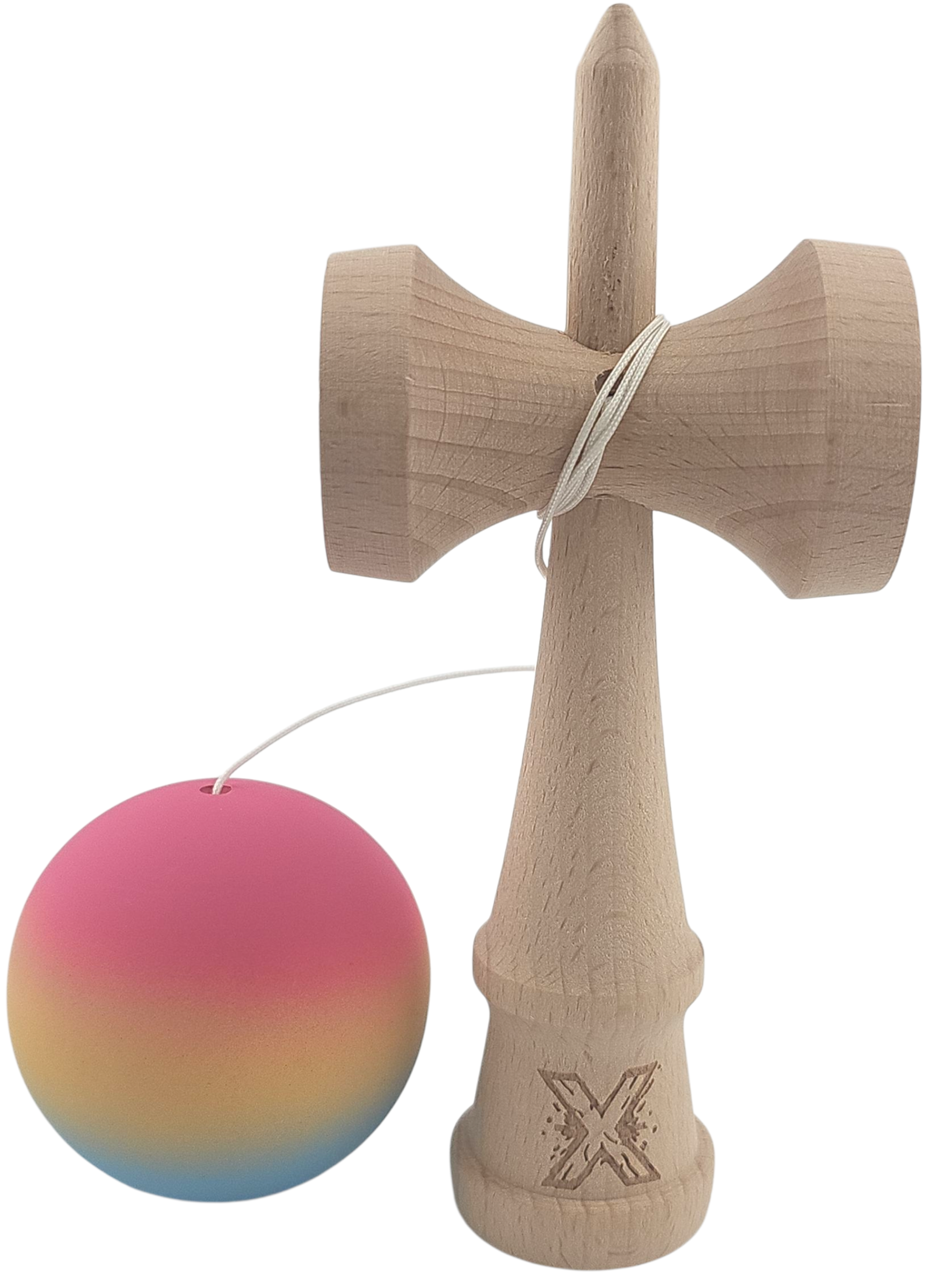 Kendama X Originala, Profesionala, Flippy, din Lemn, Rubber Grip, 18 cm, Roz/Galben/Albastru