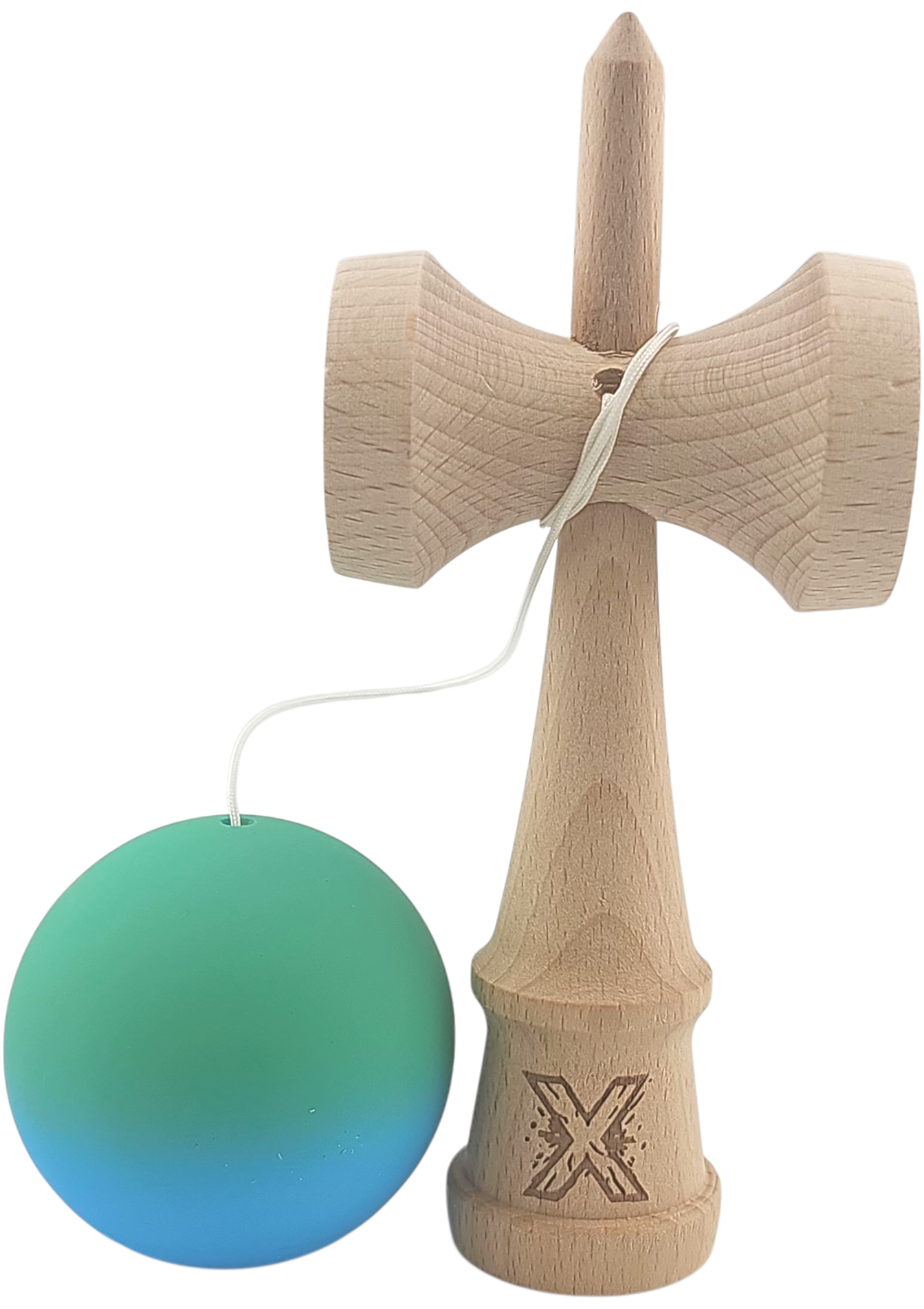 Kendama X Originala, Profesionala, Flippy, din Lemn, Rubber Grip, 18 cm, Verde/Albastru