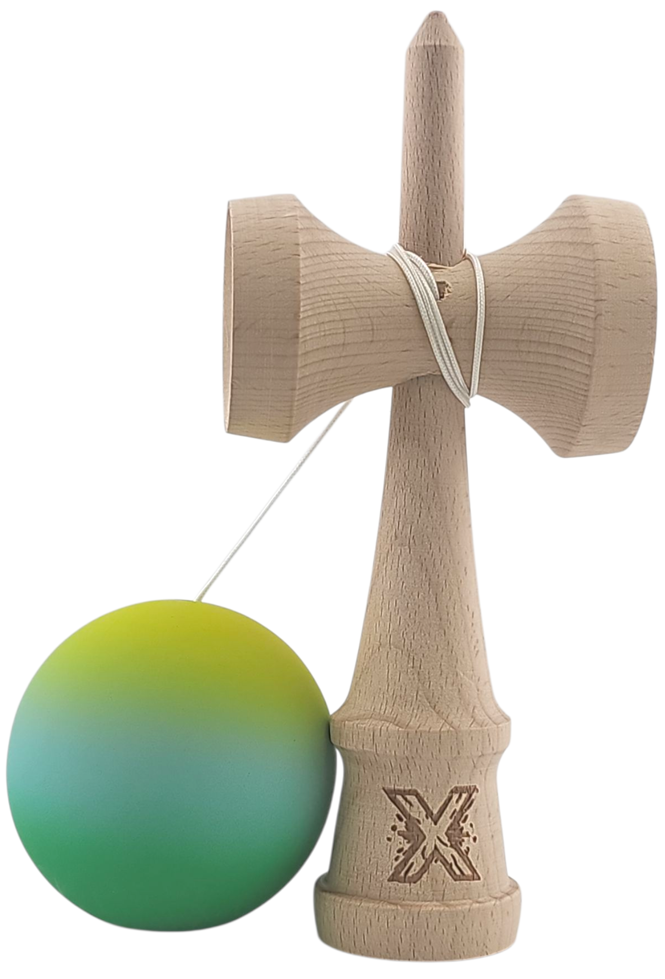 Kendama X Originala, Profesionala, Flippy, Rubber Grip, din Lemn, 18 cm, Galben/Albastru/Verde