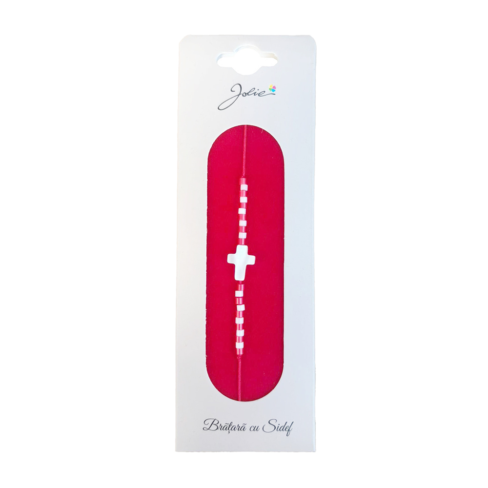 Martisor Bratara cu Sidef, Jolie, Model Cruce, cu Snur Rosu, Margele Alb/Rosu, Ambalaj de Carton