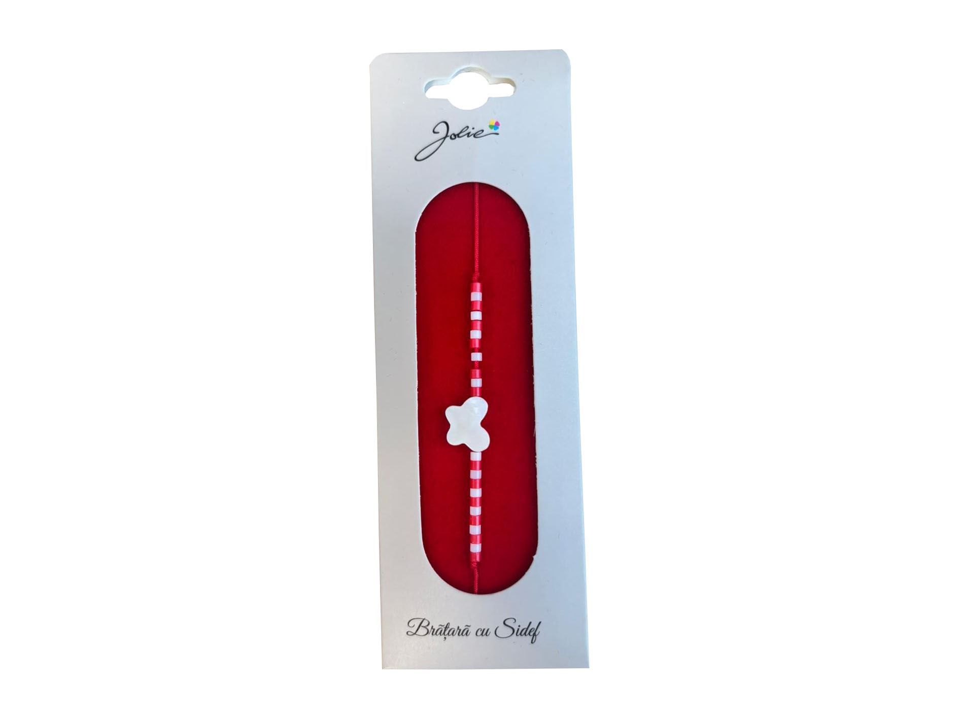 Martisor Bratara cu Sidef, Jolie, Model Fluture, cu Snur Rosu, Margele Alb/Rosu, Ambalaj de Carton