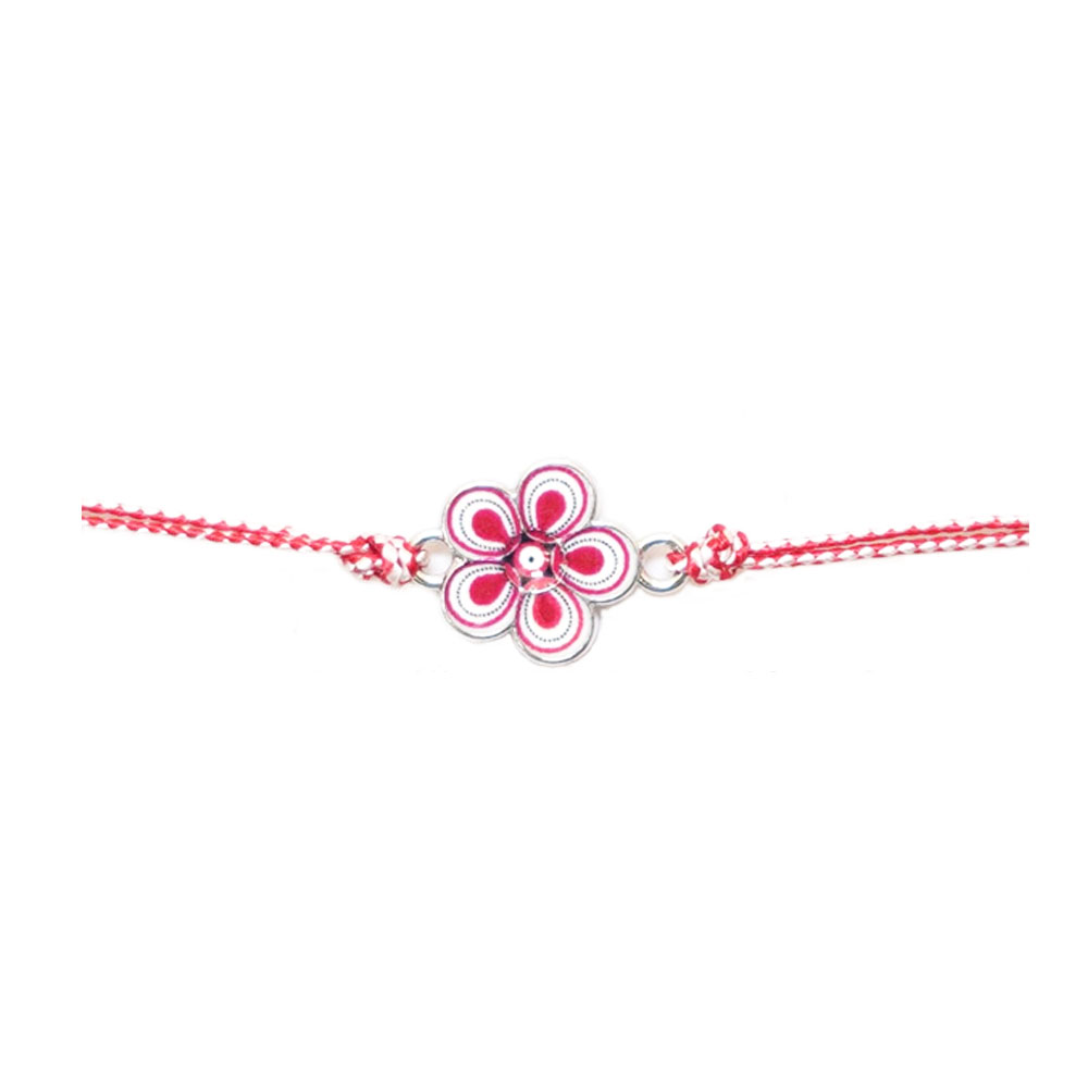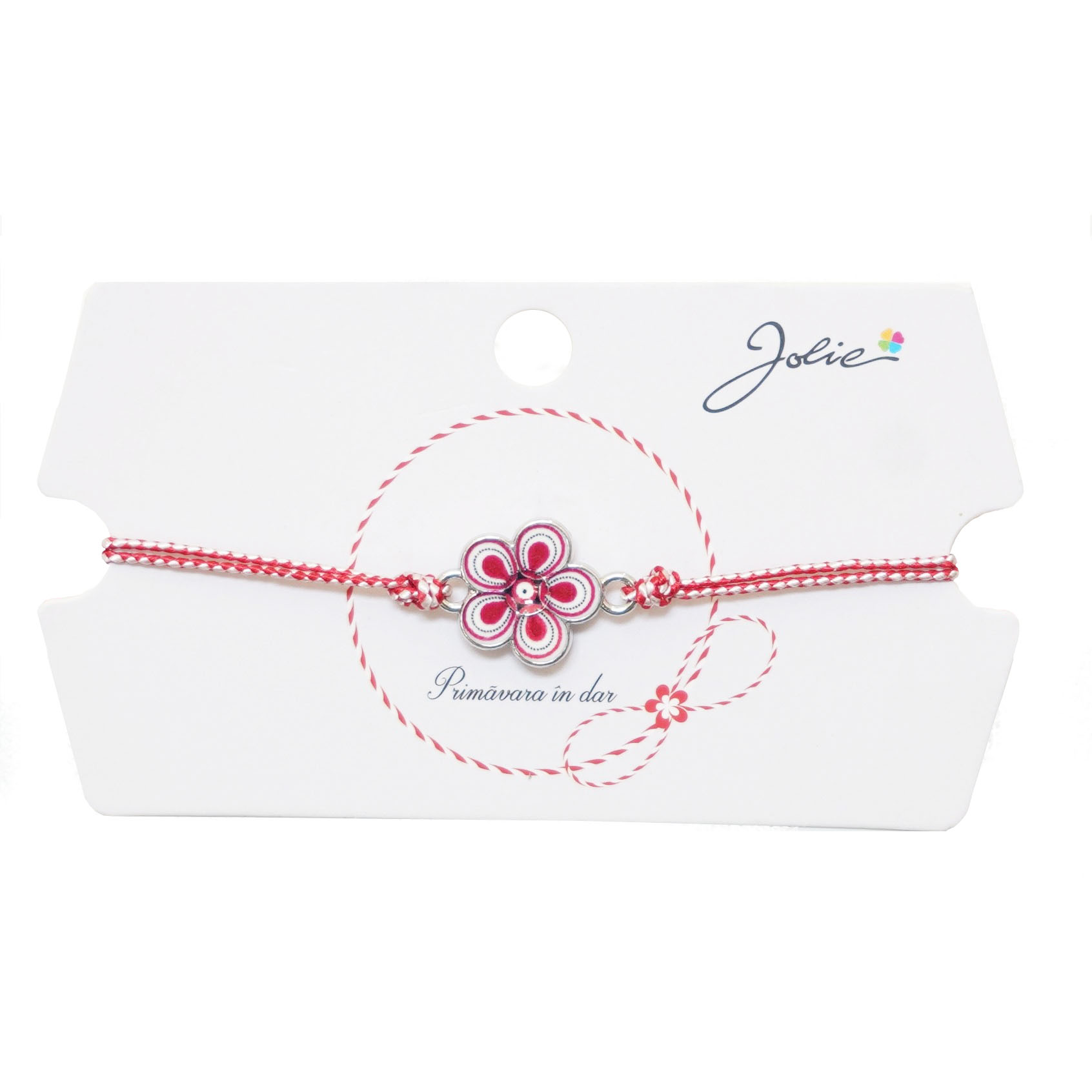Martisor tip Bratara Traditionala cu Pandantiv, Jolie, Model Floare, Snur Impletit Alb/Rosu, Dimensiune Pandativ Aprox 2 cm, Ambalaj cu Design