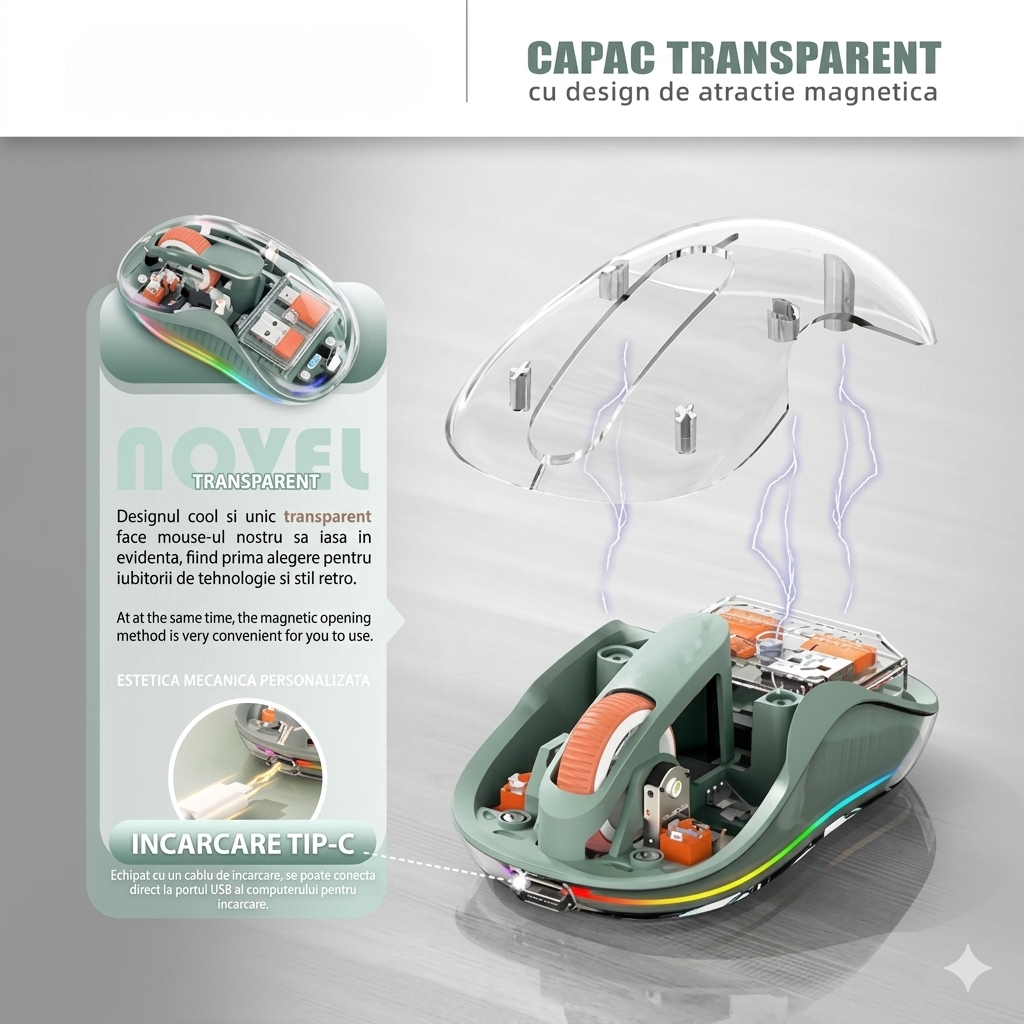 Mouse Wireless, Flippy, Dual Bluetooth, 2.4 GHz, Multi Device, USB-C, 4 Niveluri DPI 800-2400, Reincarcabil, Iluminare LED, Compatibil MacBook/iPad/Laptop, 10 x 6 cm, Verde