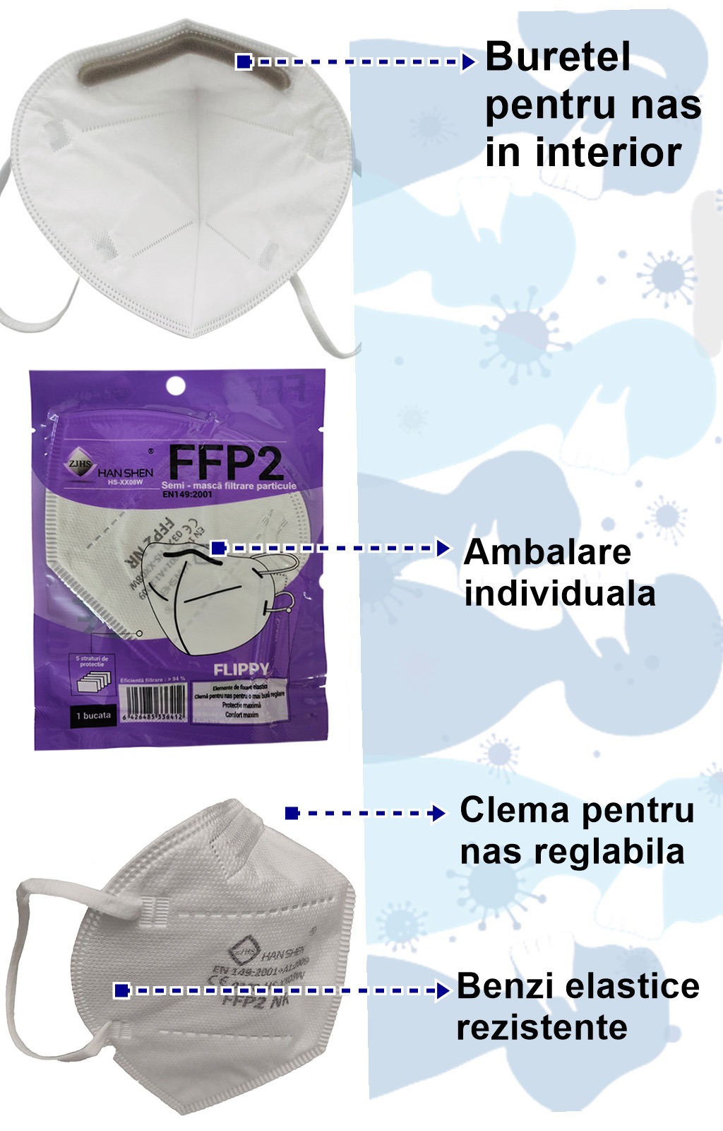 Set 30 bucati Masca de protectie faciala, Flippy, de unica folosinta pentru adulti, FFP2, KN95 CE 0370, 5 straturi, nesterila, ambalaj individual, Alb