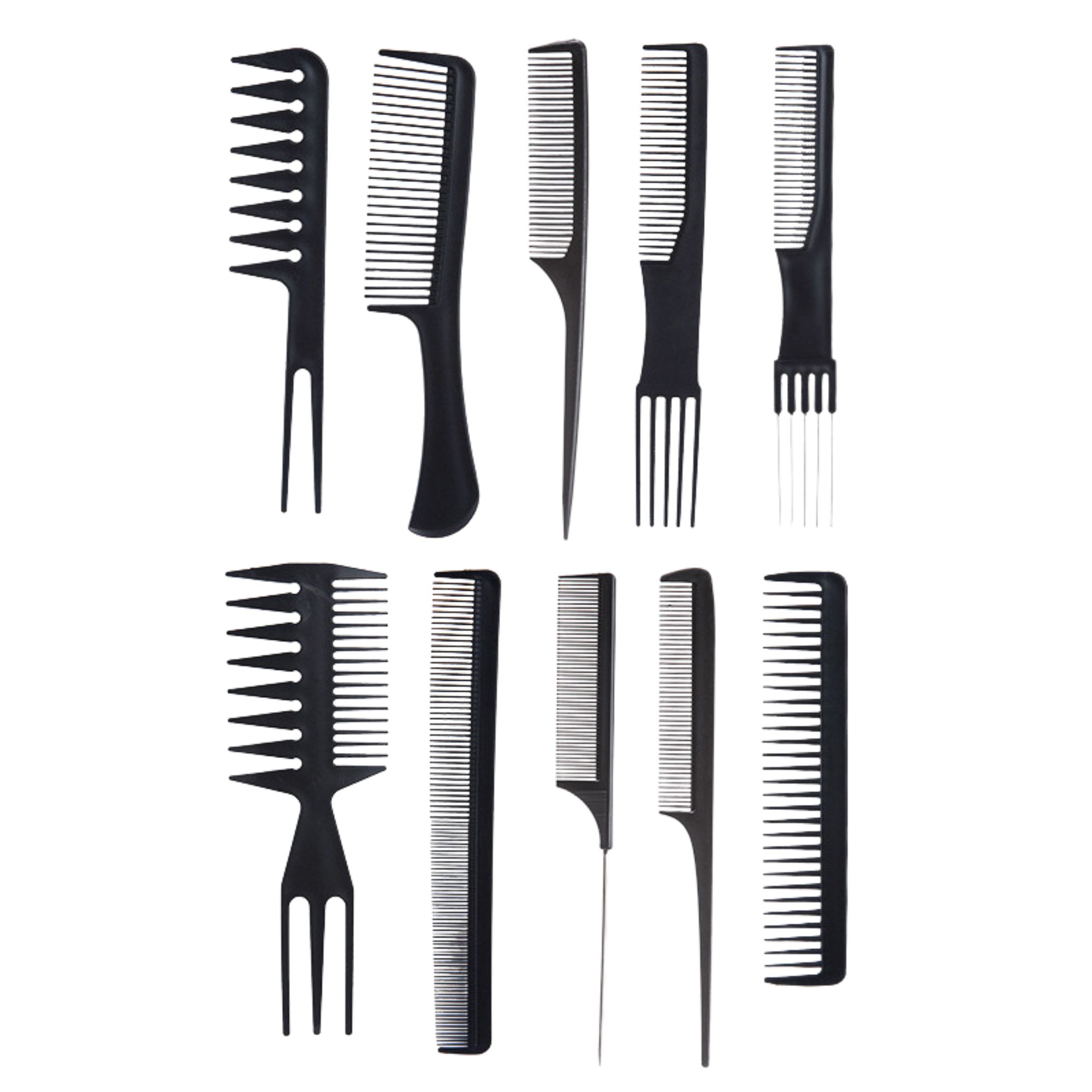 Set piepteni profesionali pentru coafat, Flippy, 10 bucati, PP + Otel inoxidabil, 18,5–22 cm, Rezistenti la caldura, Negru