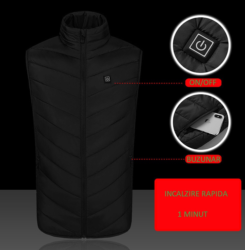 Vestă cu Încălzire, Flippy®, Unisex, 2 Zone de Încălzire, Umplutură Bumbac, 3 Trepte de Temperatură, Încărcare USB, Albastru, 74 - 84 kg, Marime XXXL
